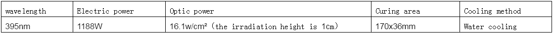 This is a high-performance UVLED curing system. The system mainly includes a controller and a UVLED irradiation head. The UV spectrum wavelength is 395nm. It uses forced water cooling to dissipate heat. The effective curing area is 170X36mm.