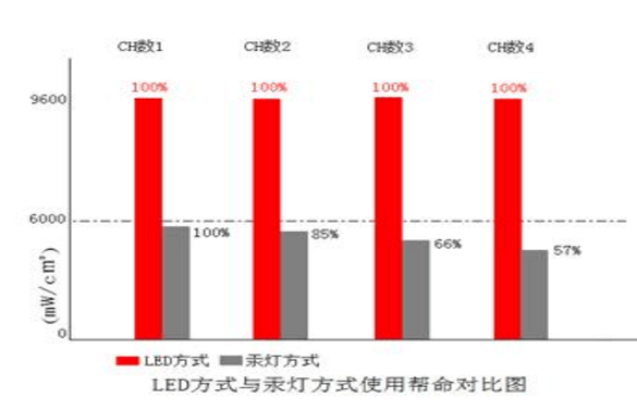 相對于傳統汞燈固化設備,其汞燈使用壽命只有1000-3000小時,而UVLED固化裝置則達到20000-30000小時,LED可以在需要紫外光時瞬間點亮,按DUIY=1/5(準備時間=5照射時間=1)時,LED方式使用壽命相當于汞燈40倍,減少更換燈管時間,提高了生產效率,同時也非常節能;而傳統汞燈固化設備在工作時,由于汞燈需要預熱,開閉會影響汞燈壽命,所以燈管必須一直點亮,不僅縮短了汞燈使用壽命也造成不必要的電力消耗。